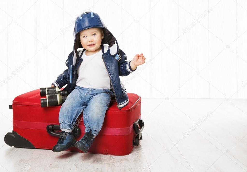 Baby and Suitcase, Kid Sitting on child's sit on suitcase