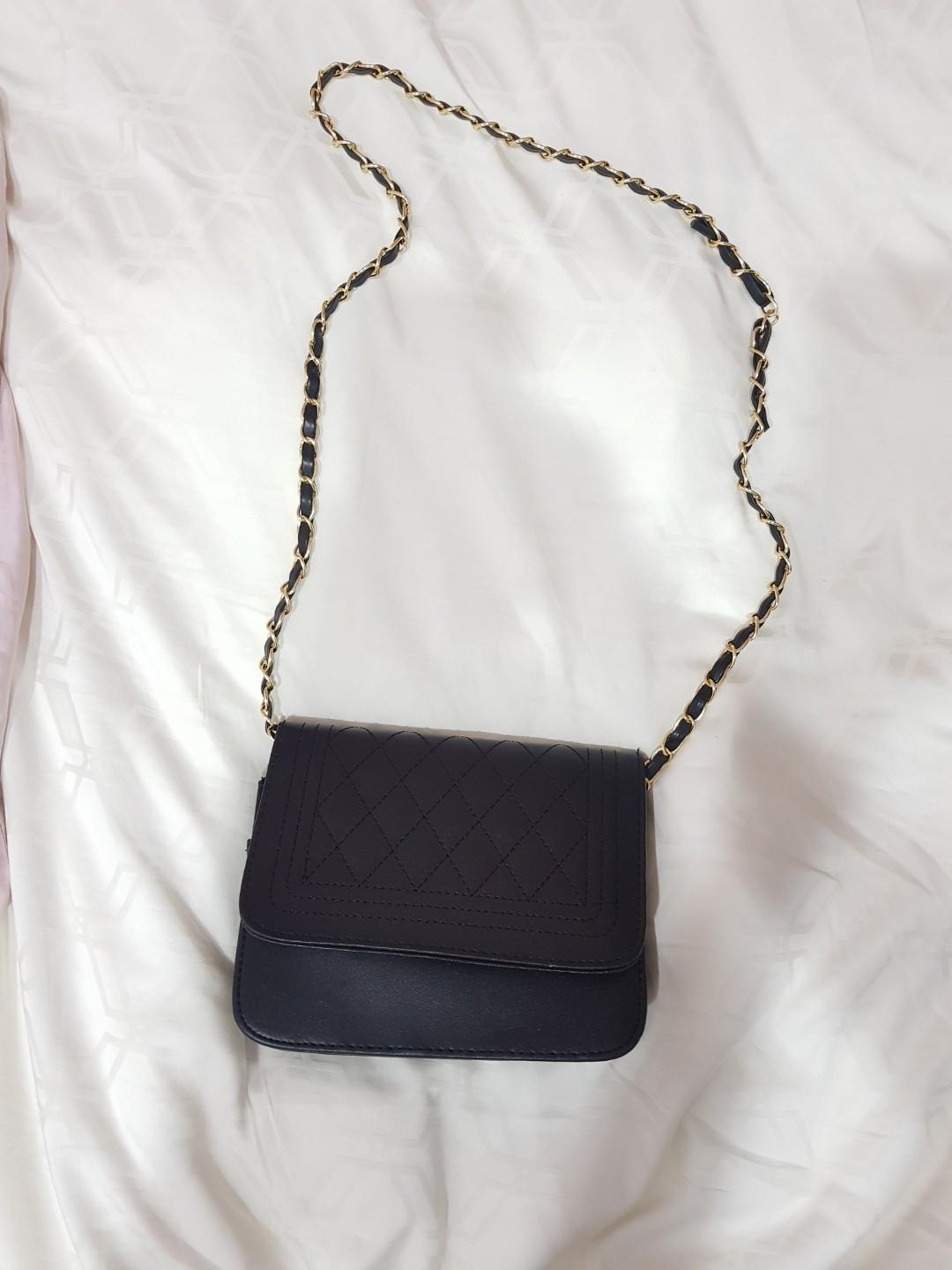 black sling bag with gold chain
