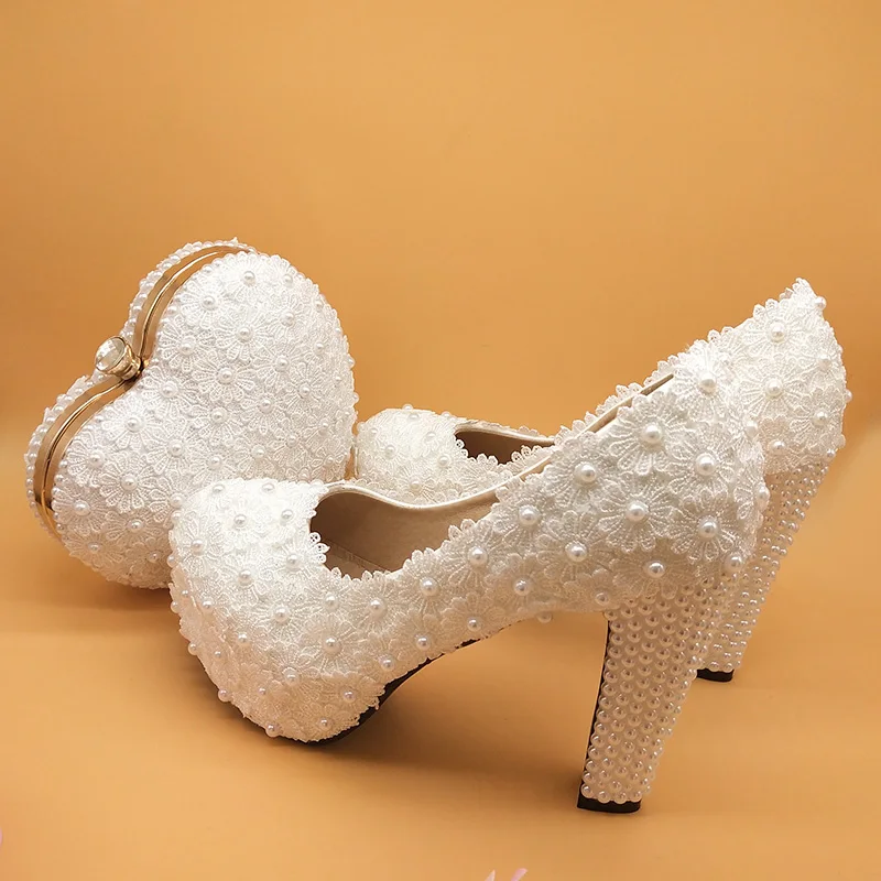 High heel shoes Thick Heel heart purse white shoes and bag for wedding
