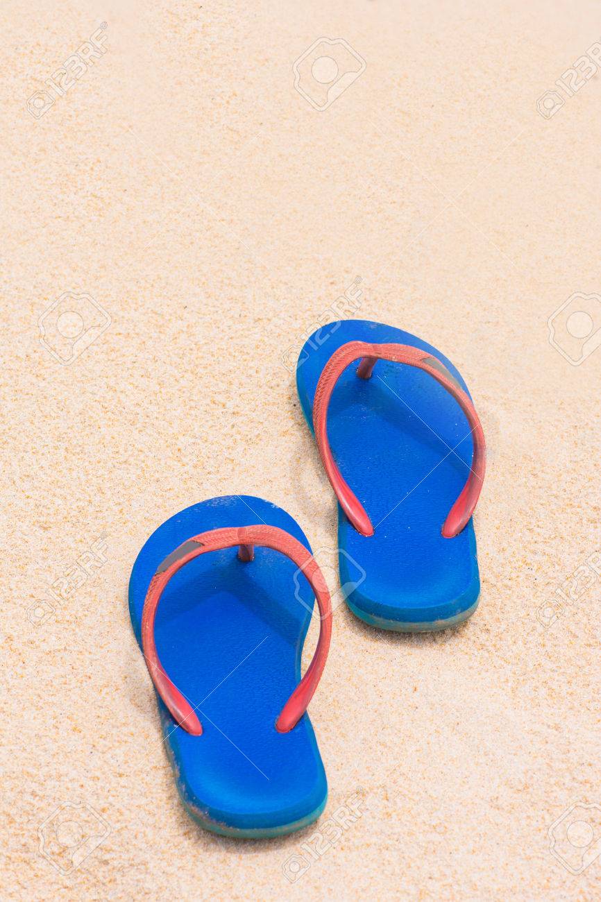 Blue Rubber Slippers On The Sand, Beach Stock Photo, Picture And rubberen slippers