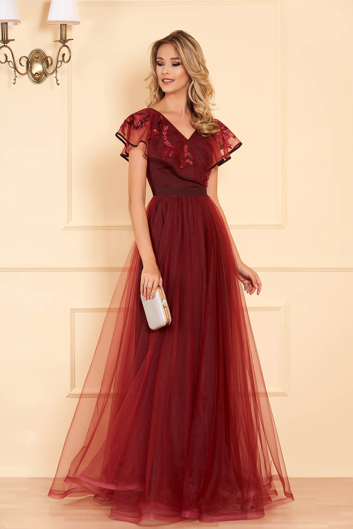 Beaded Ruby Red Tulle Off-shoulder Long long dress