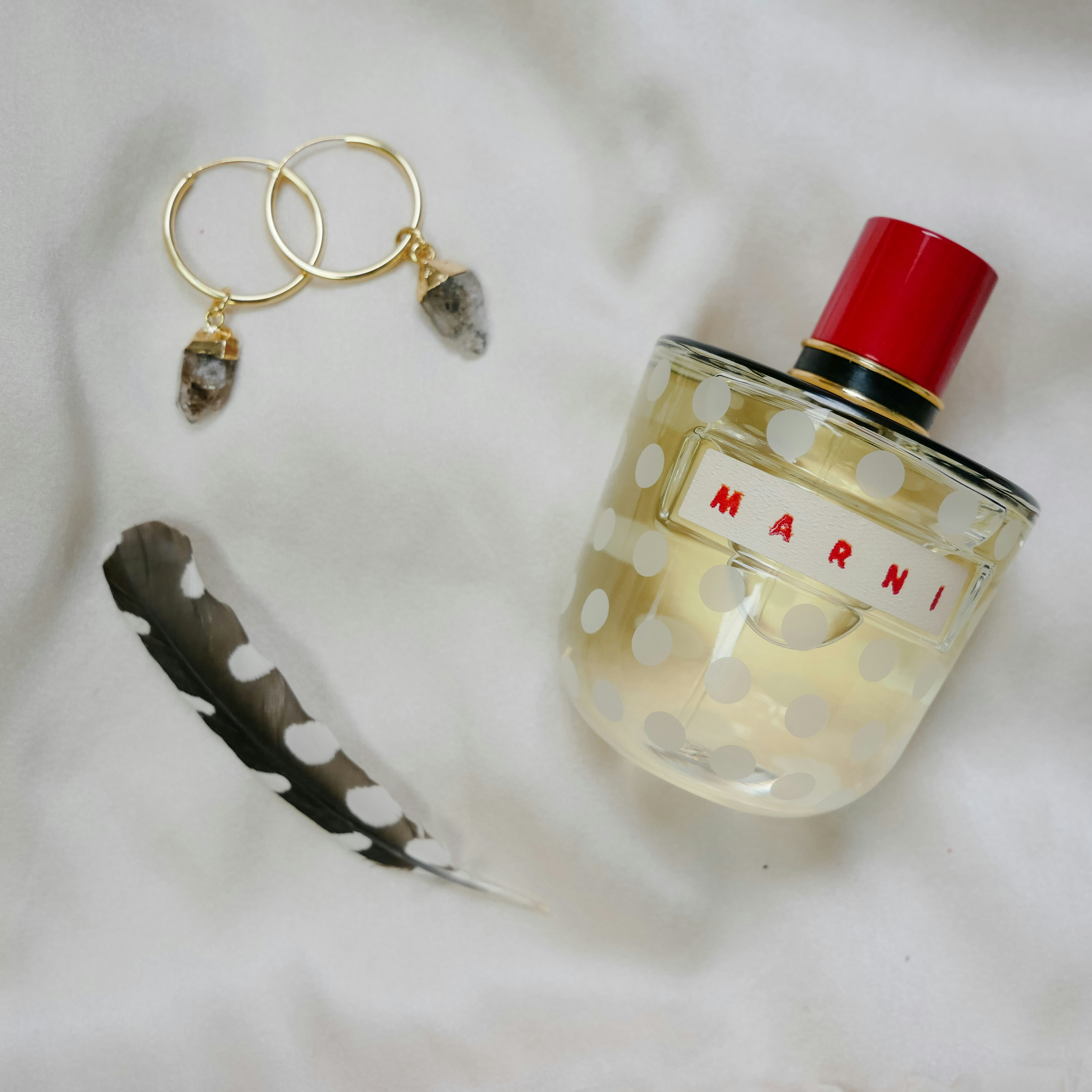 gray feather, and pair of gold-colored marni fragrance