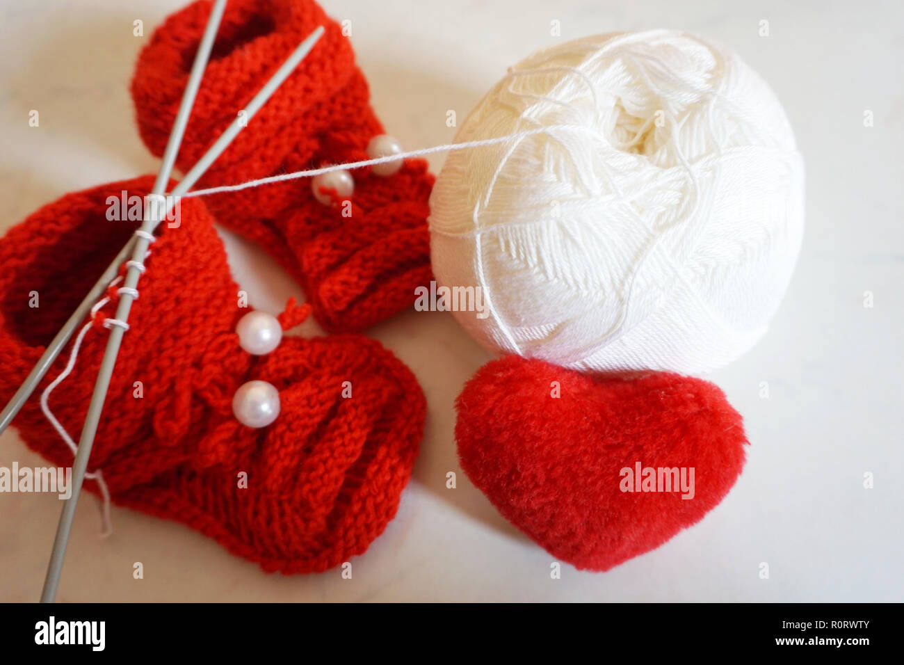La sfera bianca di lana per maglieria e maglia rossa scarpe per maglieria per bambini