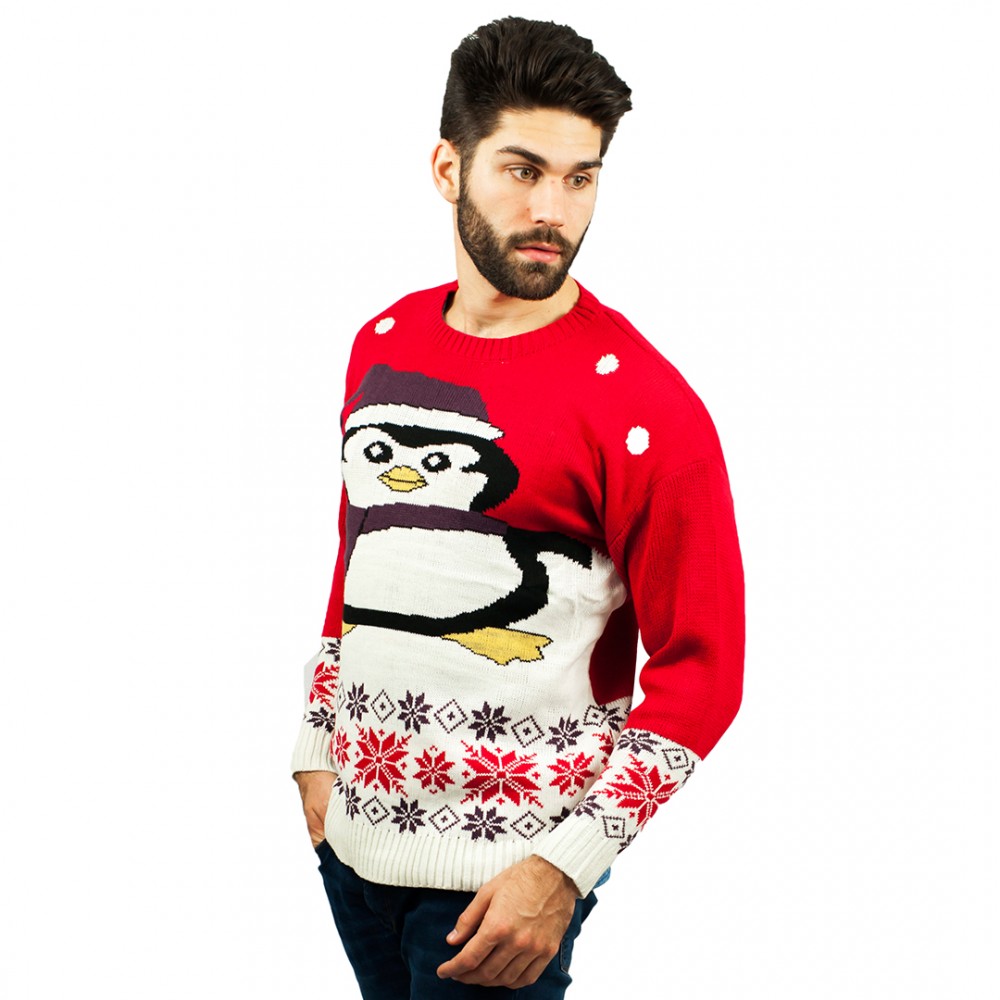 C3009 RD - Pull de Noël pour homme avec motif pingouin rouge pull pingouin noel