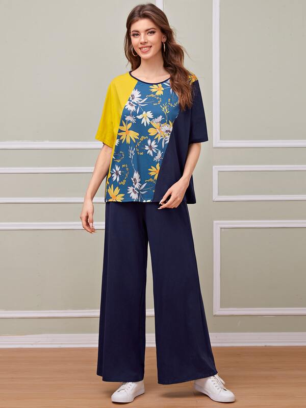 Ensemble pantalon ample et top fleuri avec blocs de couleurs | Mode en ligne | SHEIN FRANCE ensemble pantalon ample