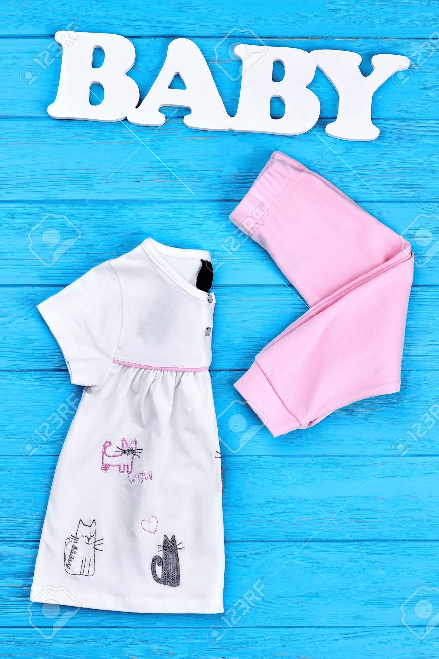 Ensemble De Mode Bébé-fille D'été. Belle Tenue De Marque Pour Les Petites Filles, Mot Bébé, Fond En Bois Bleu. Achetez Des Vêtements Naturels Pour La Petite Fille. Banque D'Images Et Photos Libres ensemble marque bebe
